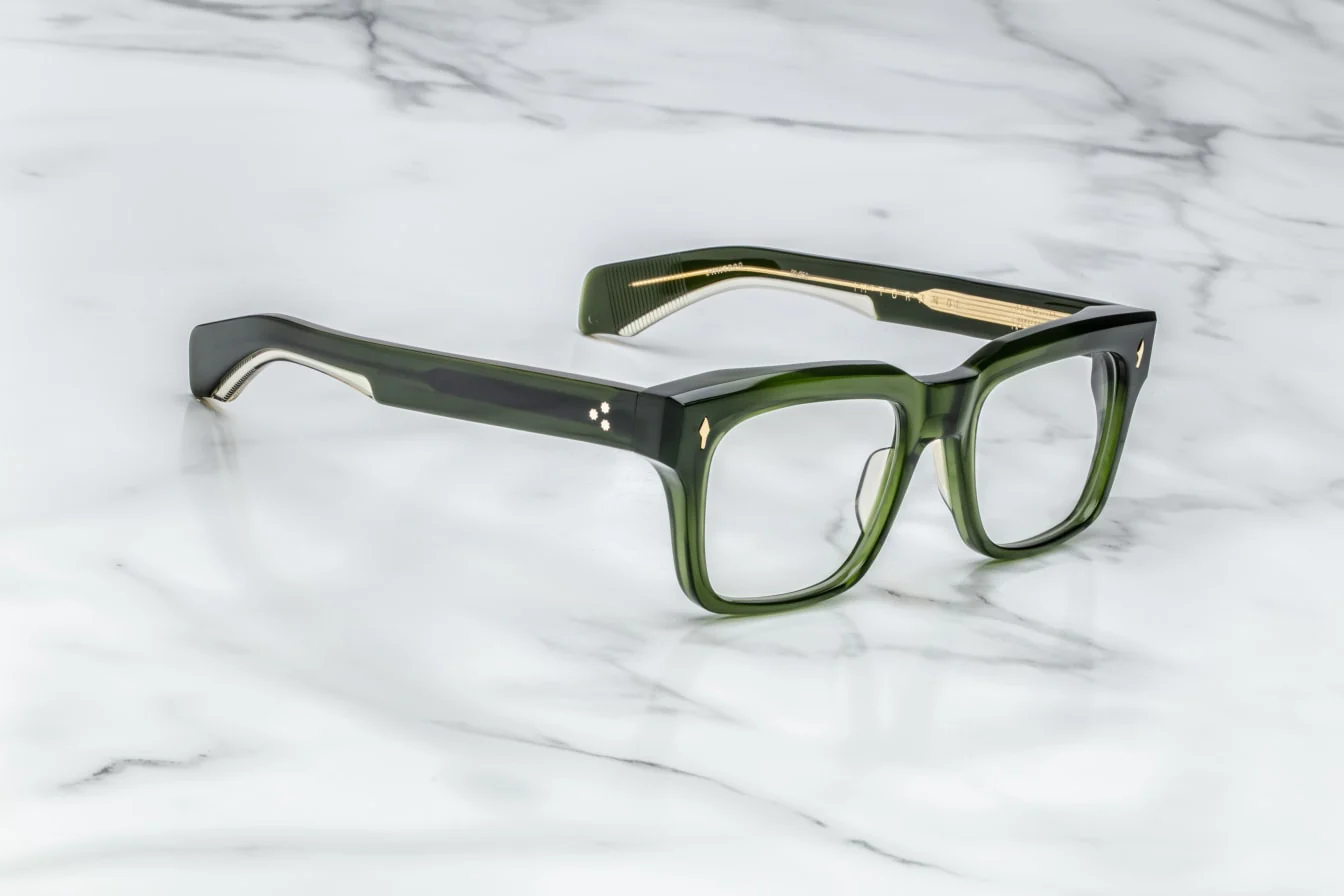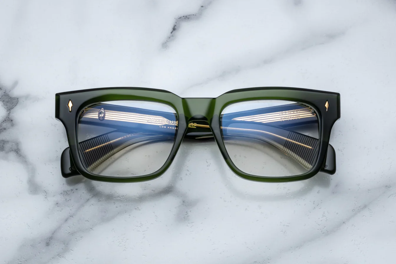 Jacques Marie Mage TORINO – ROVER (JMMTR-20) are 60’s inspired sunglasses with angular design and bold rectangular shape, inspired by the Teatro Regio Torino, a historic Italian theater. They feature green 10mm cured cellulose acetate frame, custom double laminated temples, gold signature arrowhead front pin, internal wirecore decoration, tension-secured custom 7 barrel hinge, 6 base CR39 lens with backside anti-reflective treatment and 100% UV protection.